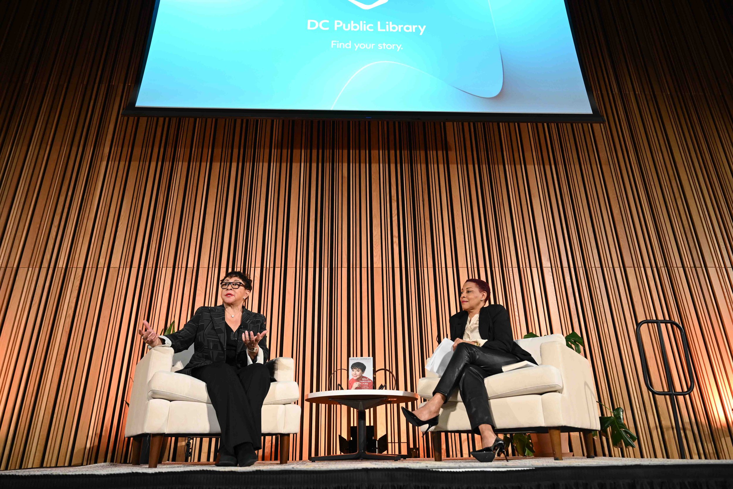 Sheila Johnson, co-founder of Black Entertainment Television, discusses her memoir Walk Through Fire with Jamise Harper at the MLK Library in Washington, DC.